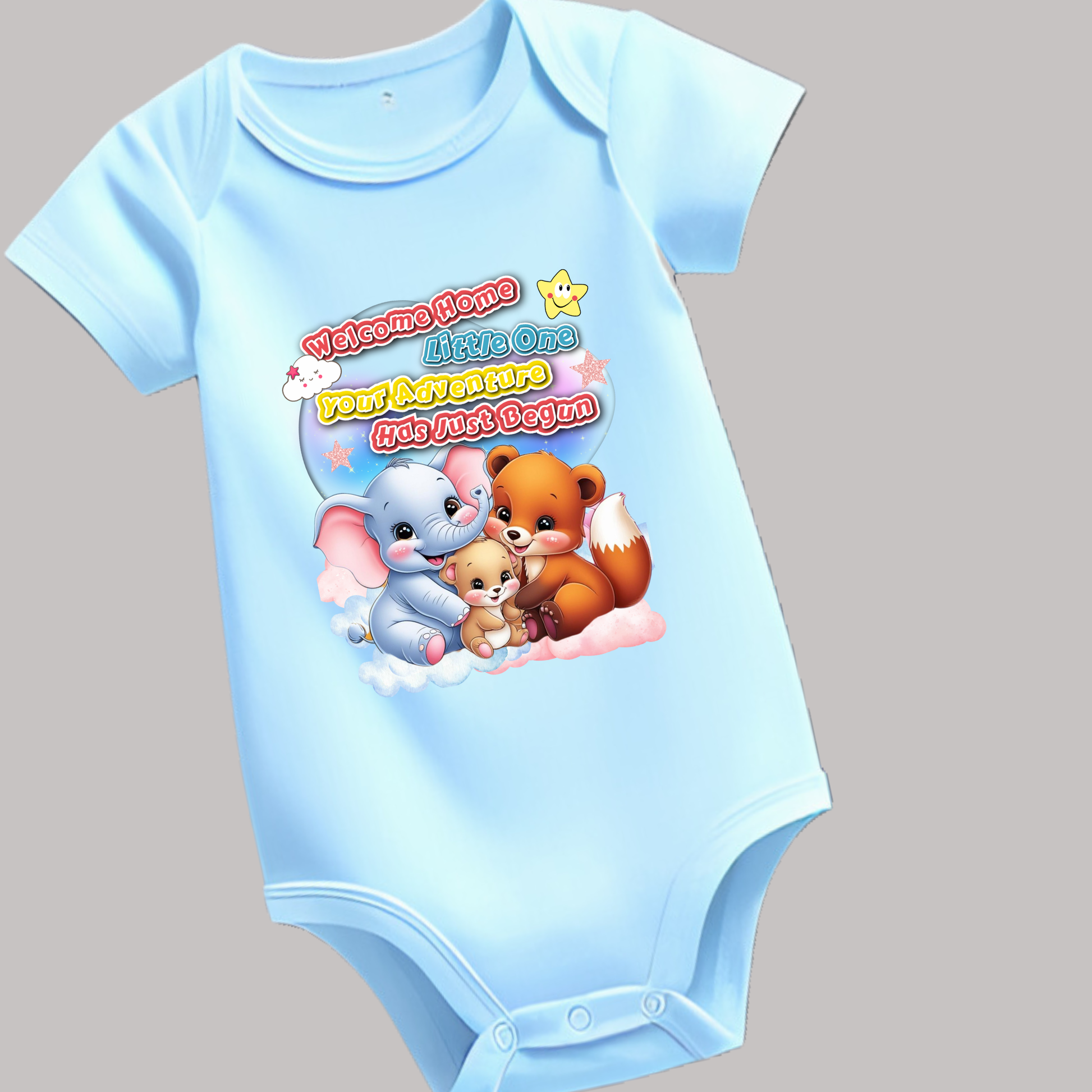Welcome your little one home in the cutest and comfiest baby romper! Made with soft, breathable cotton, this adorable outfit features a charming print of baby animals and a heartwarming message: