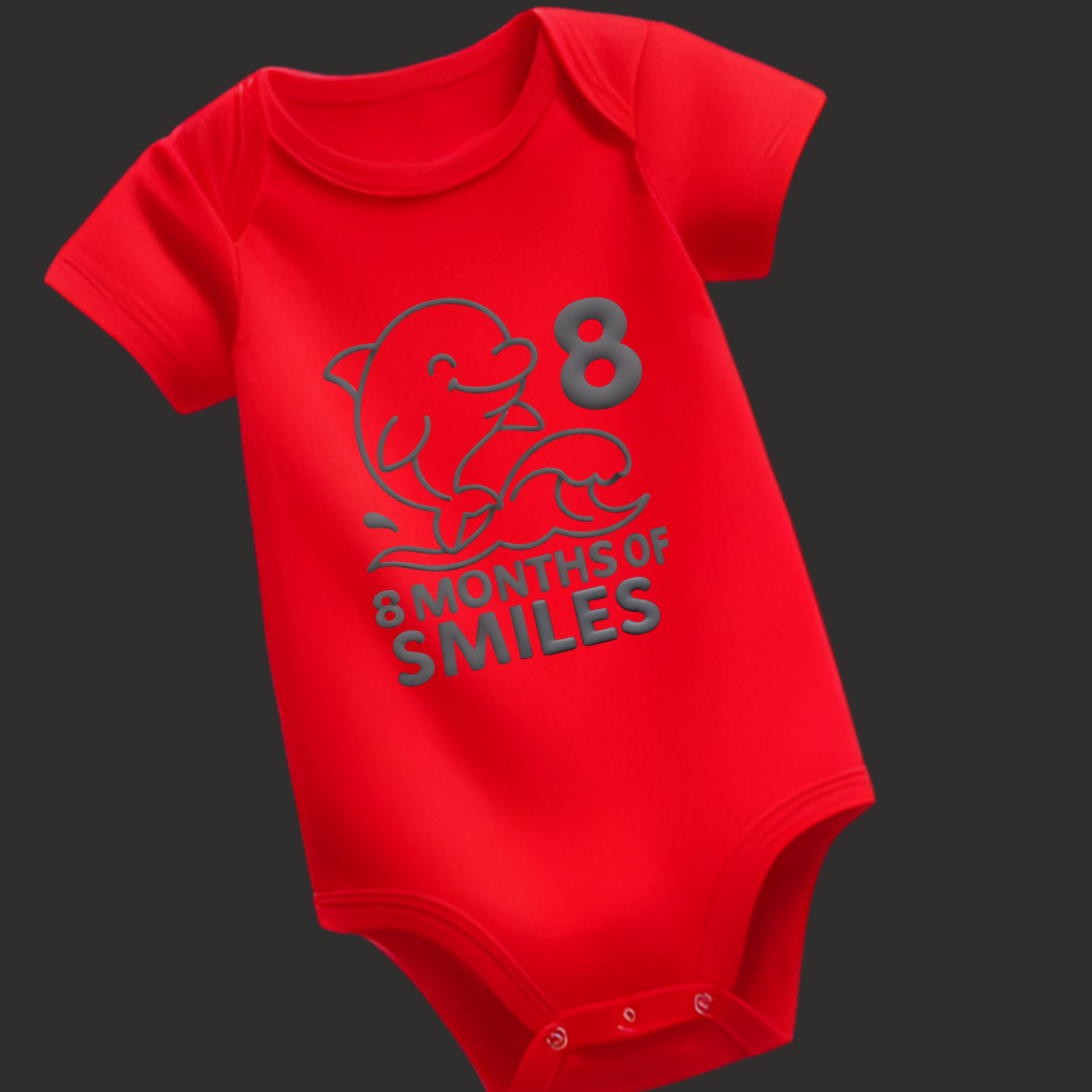 Celebrate your baby's 8-month milestone with our adorable "8 Months of Smiles" romper, featuring a cute dolphin leaping over a wave in a bold, single-color puff print. This comfy and cheerful design is perfect for capturing memories and clicking milestone pictures!