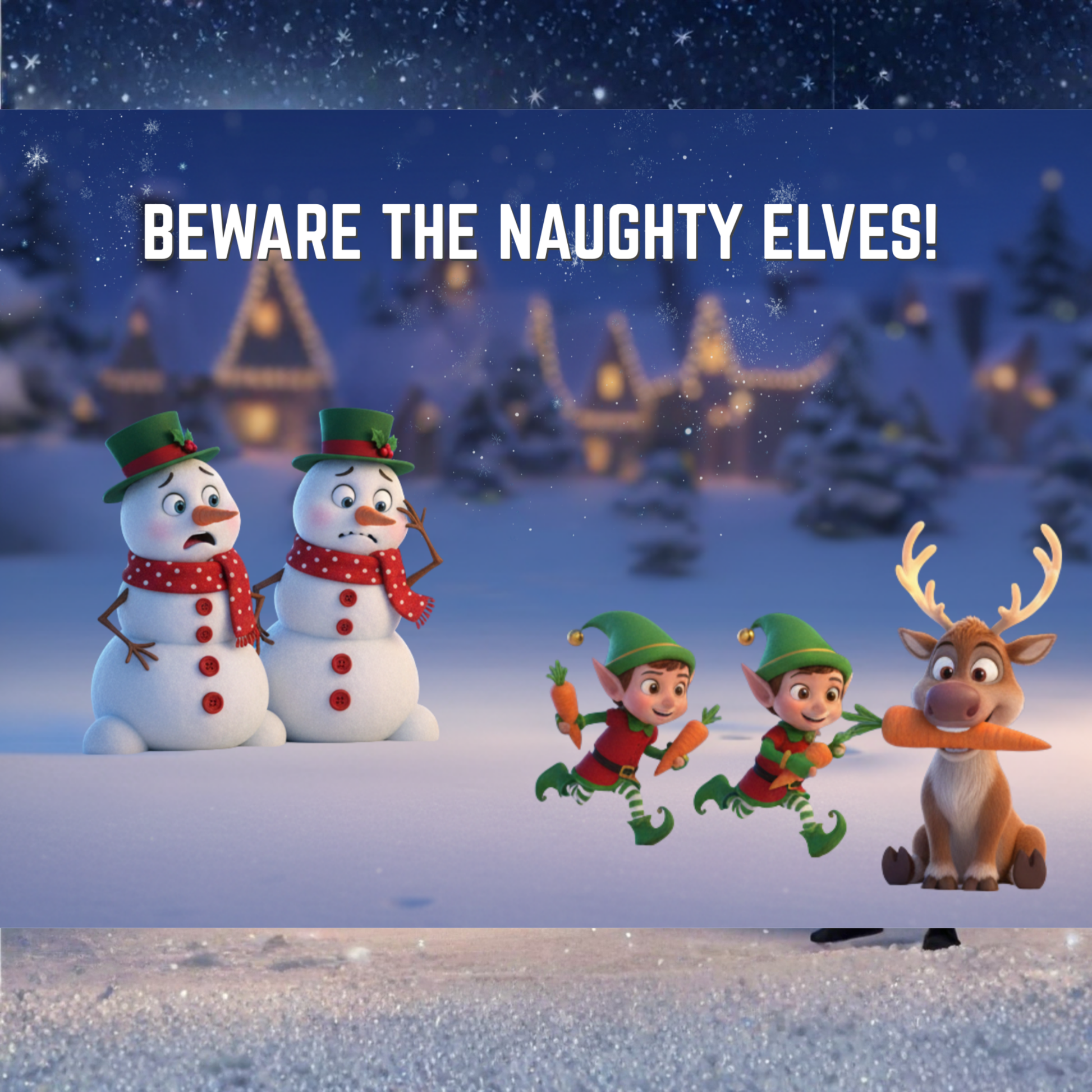 This playful scene features cheerful snowmen, mischievous elves, and a relaxed reindeer enjoying a stolen carrot — perfect for holiday excitement.
